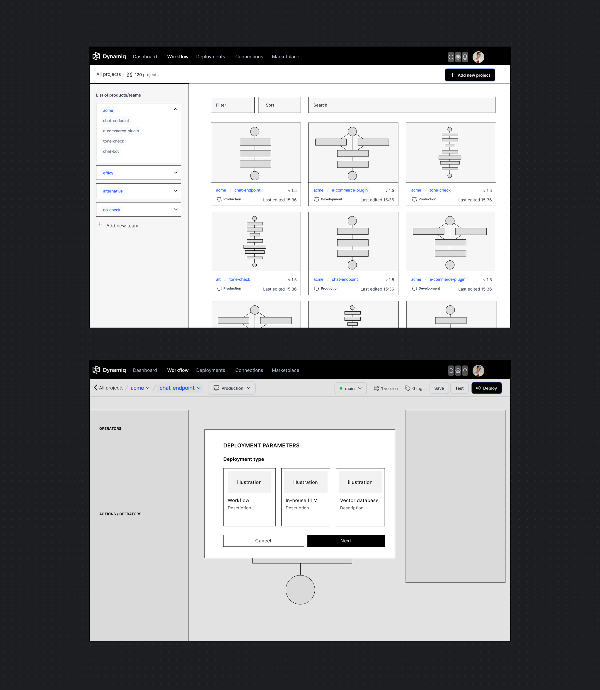 We developed wireframes that focused on simplifying complex tasks, like workflow creation and deployment. Through several iterations, the layouts were refined to ensure users could easily navigate between workflows, metrics, and AI interactions. These wireframes acted as the blueprint for building an intuitive interface that minimizes the learning curve for non-technical users while offering scalability for more advanced users.