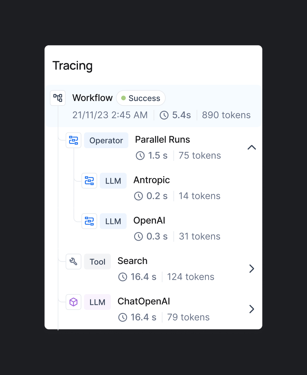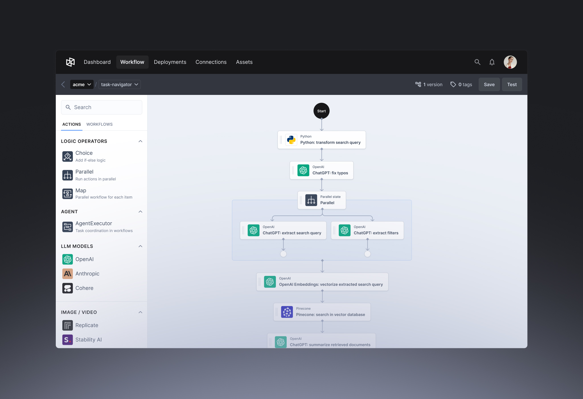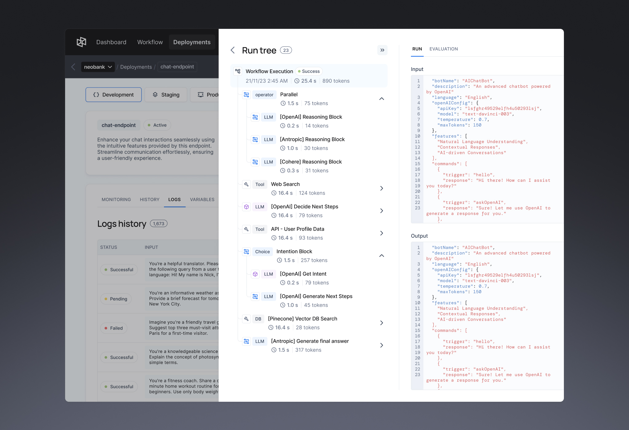 The platform includes observability features that help users monitor every interaction in their workflows. This includes logging, evaluating workflow quality, and ensuring compliance across operations. The interface enables users to track changes and maintain control of their deployments, keeping workflow processes transparent and reliable.