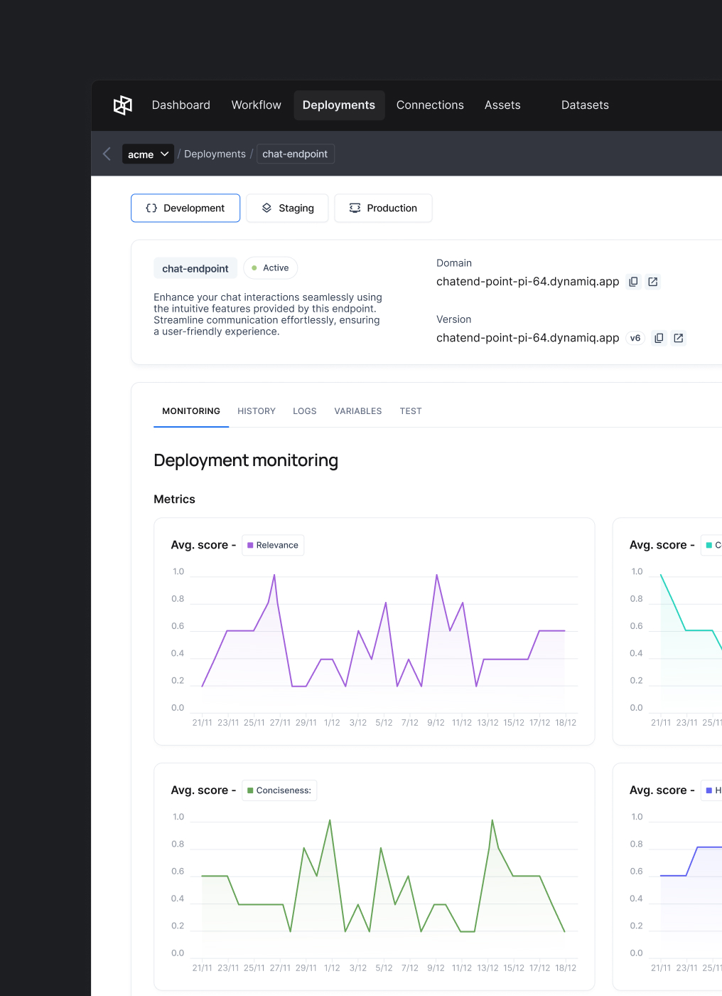 Deployment of AI workflows is handled through a simple interface that guides users from development to production environments. Users can monitor key metrics such as performance scores and efficiency, with real-time monitoring features for better decision-making. The focus was on making deployments accessible, with clear paths from setup to final output.