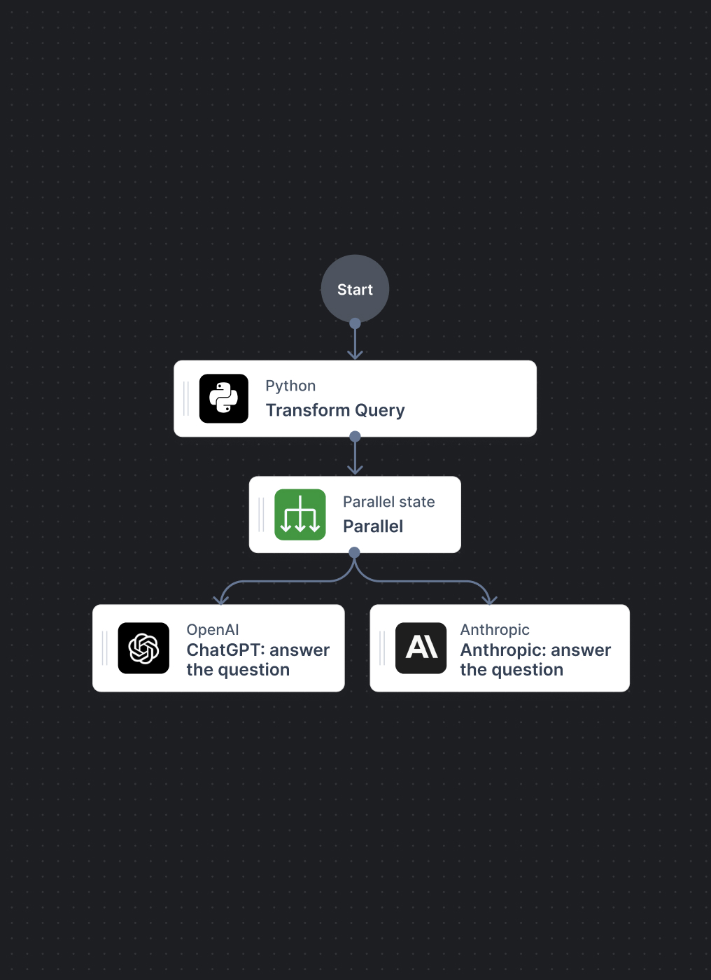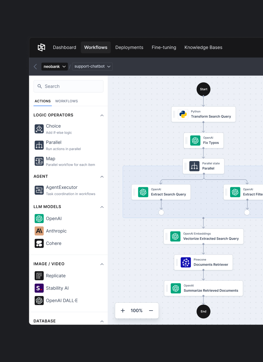 The platform's drag-and-drop builder allows users to construct complex workflows by selecting AI modules, configuring states, and connecting various tools like OpenAI and databases. The layout was designed to be visually intuitive, ensuring that users can manage inputs, outputs, and error handling with ease. The workflow creation process is streamlined to accommodate both technical and non-technical users.