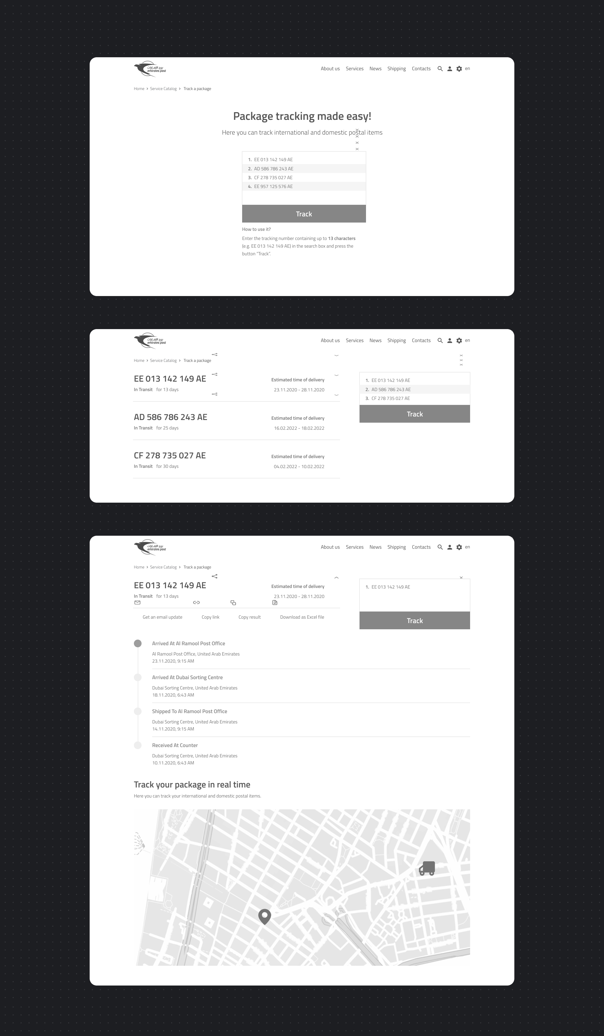 The project focused on refreshing the Emirates Post website while keeping the visual tone aligned with a government institution. Our team conducted stakeholder interviews and business research to understand the required clarity and structure. Through low-fidelity wireframes, we reorganized the information architecture and refined key functional pages such as parcel tracking. The final high-fidelity designs introduced a modern look supported by subtle illustrations and improved usability.