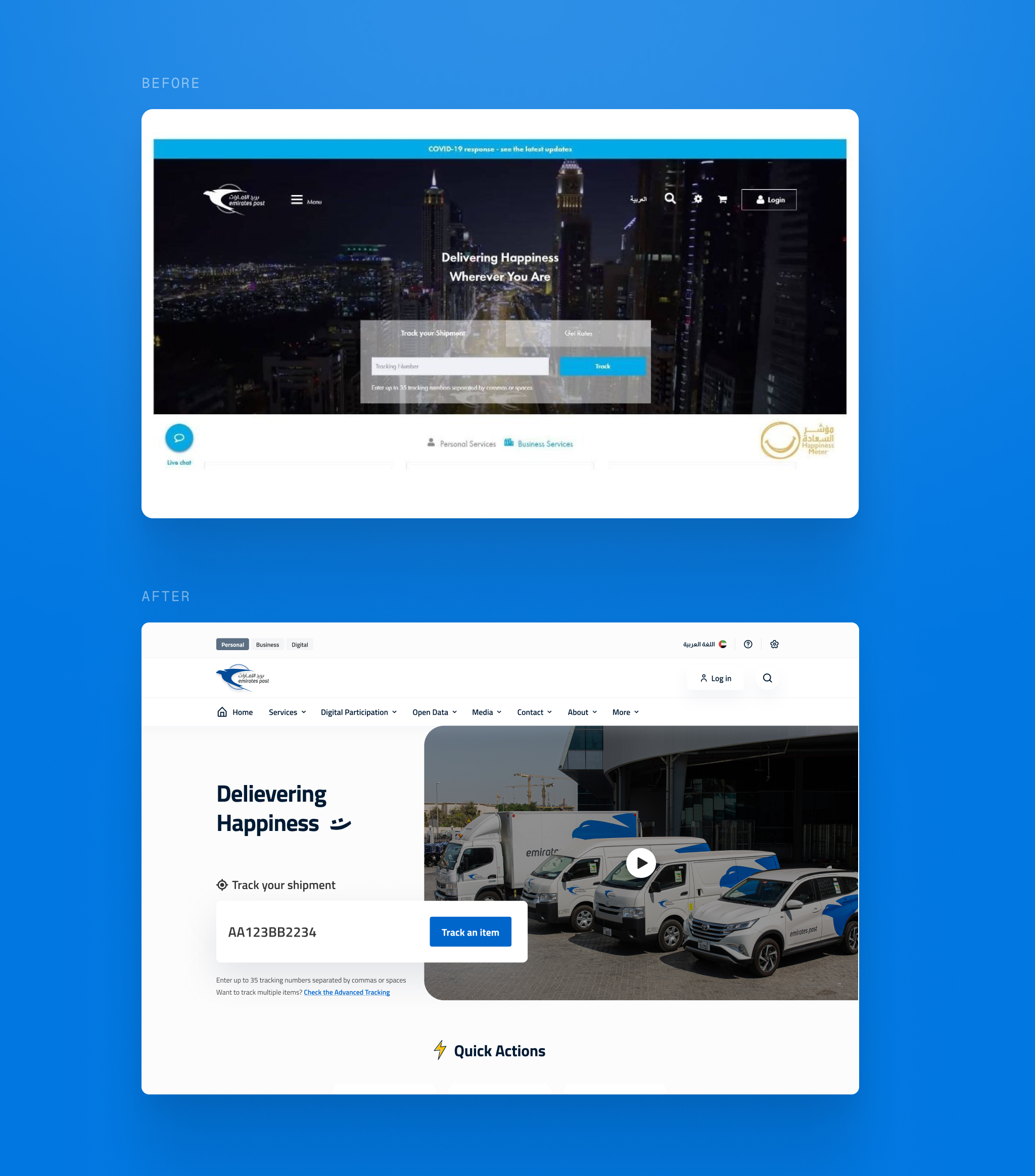 Challenge: Their outdated website lacked modern design and functionality, hindering navigation and accessibility. Emirates Post needed a user-friendly interface, improved usability, and new features to better serve their diverse audience.